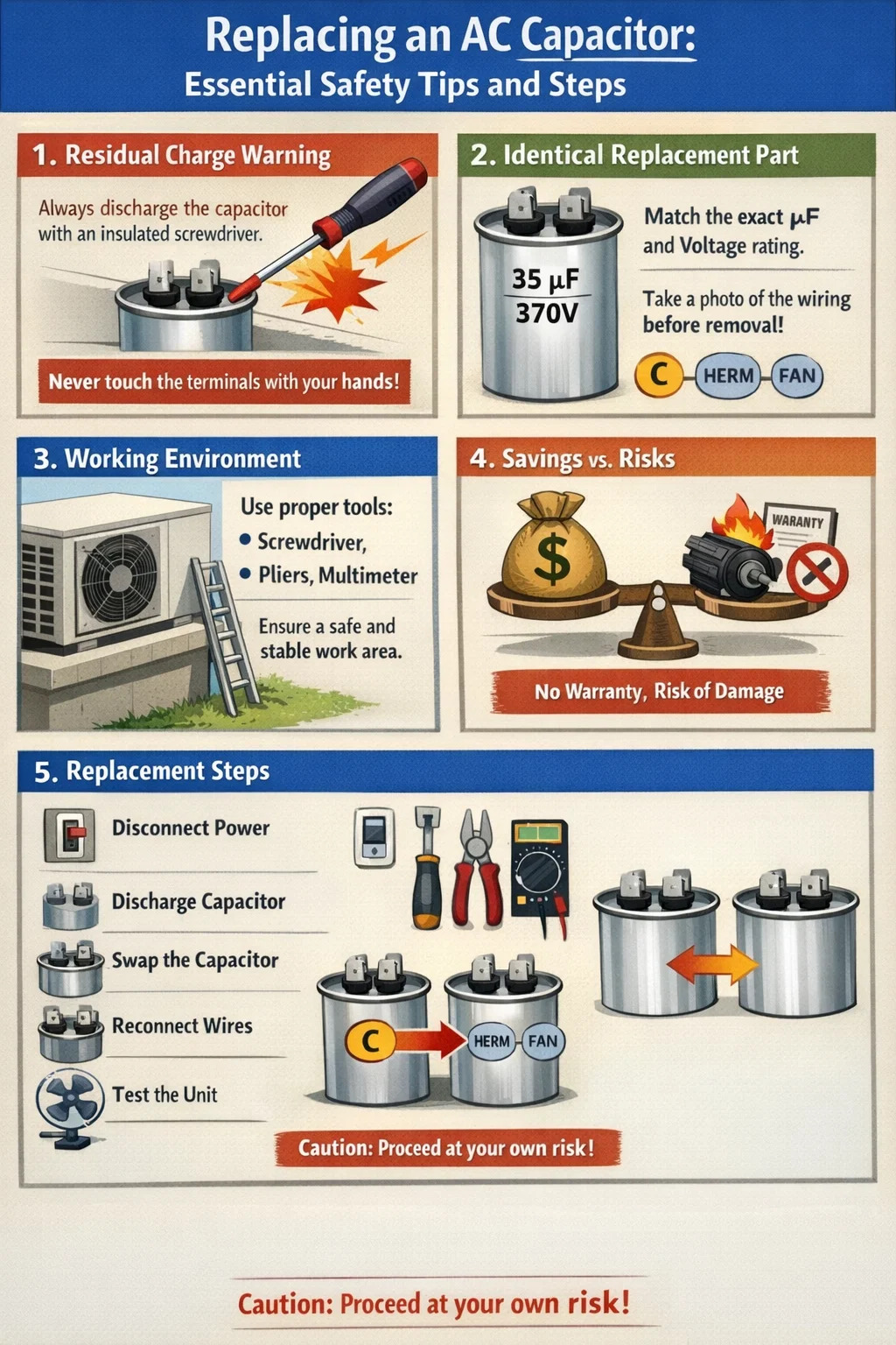 Garantía anulada: si su aire acondicionado aún está en garantía, reemplazar el capacitor de CA usted mismo puede anular la garantía del fabricante.