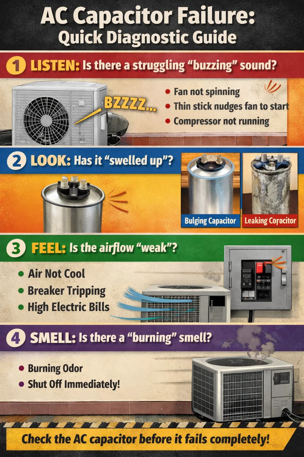 Cuando enciende el aire acondicionado, si escucha un "zumbido" continuo proveniente de la unidad exterior, pero el ventilador no gira o el compresor no arranca, esto suele ser una señal típica de falla del capacitor.