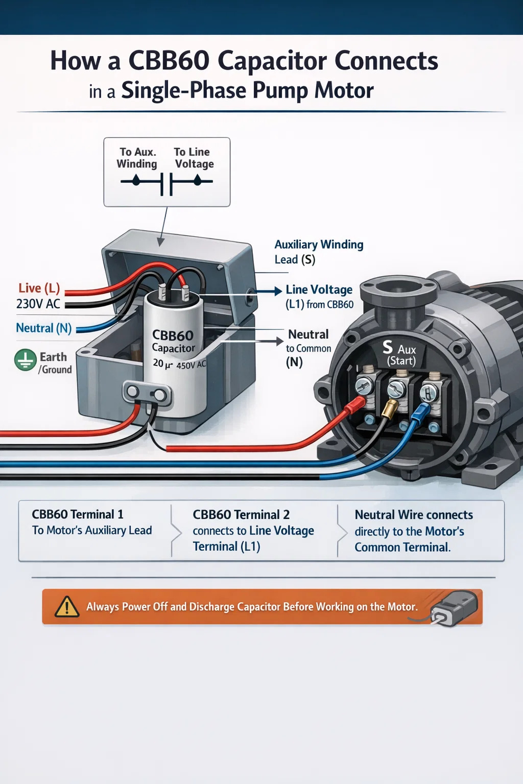 Para el escenario más común (un motor de bomba monofásico con una caja de capacitor externa), el cable vivo entrante y el cable auxiliar del motor aterrizan en el CBB60, mientras que el neutro se conecta directamente al terminal común del motor. El motor funciona porque la corriente a través del capacitor adelanta el voltaje de suministro en aproximadamente 90 grados, produciendo el campo magnético giratorio que un suministro monofásico por sí solo no puede crear.