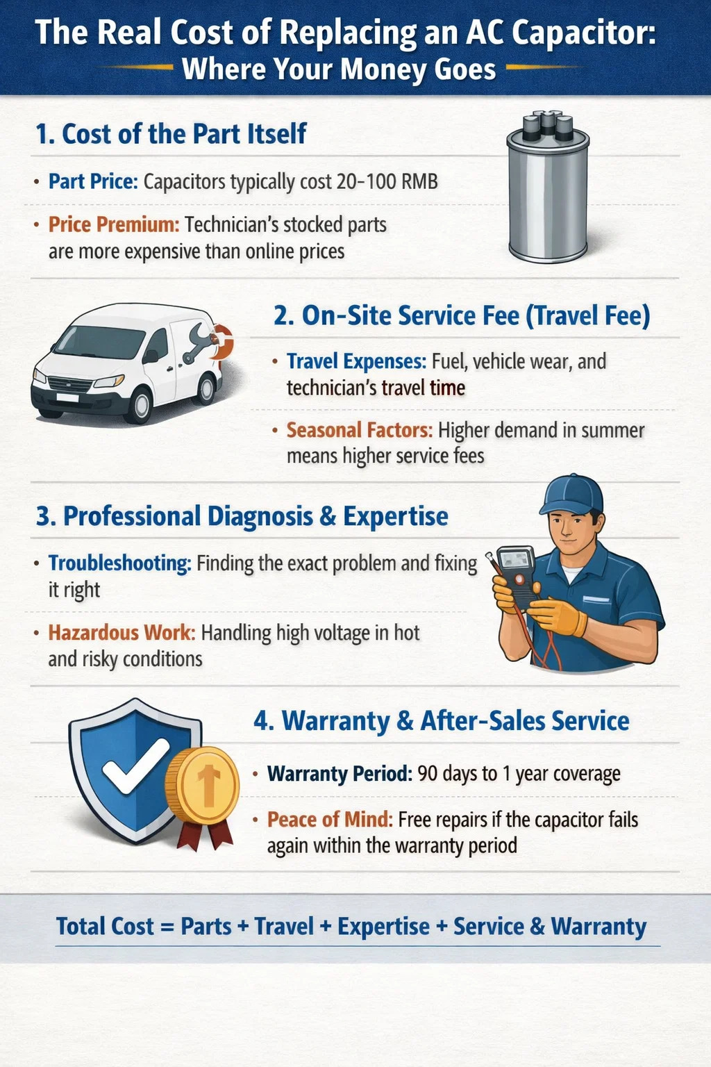Período de garantía: los condensadores de CA reemplazados por empresas profesionales suelen tener una garantía por un período determinado (por ejemplo, 90 días o un año). Si el condensador vuelve a fallar durante este período, generalmente brindarán servicio gratuito en el sitio. El dinero extra que paga es esencialmente un seguro para esta "tranquilidad".