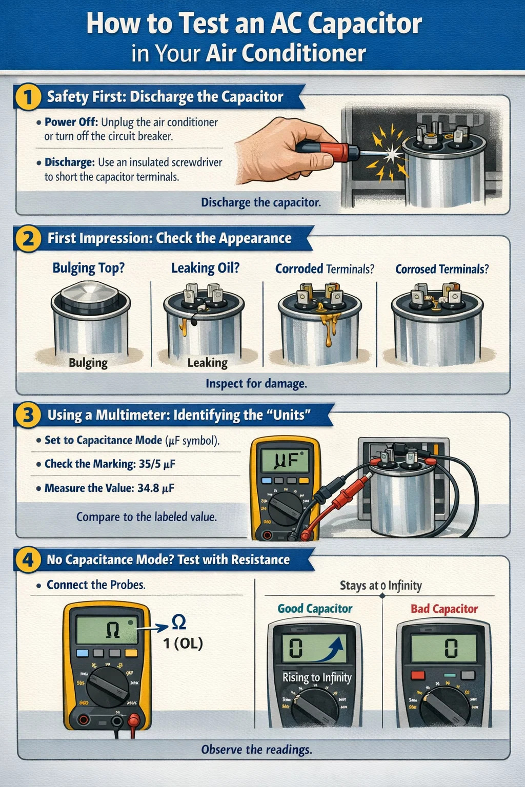Este paso es el más importante antes de comenzar a realizar la prueba. Un condensador de CA es como una batería; Incluso después de cortar la alimentación, es posible que aún contenga una carga de alto voltaje y tocarlo directamente podría provocar una descarga eléctrica grave.