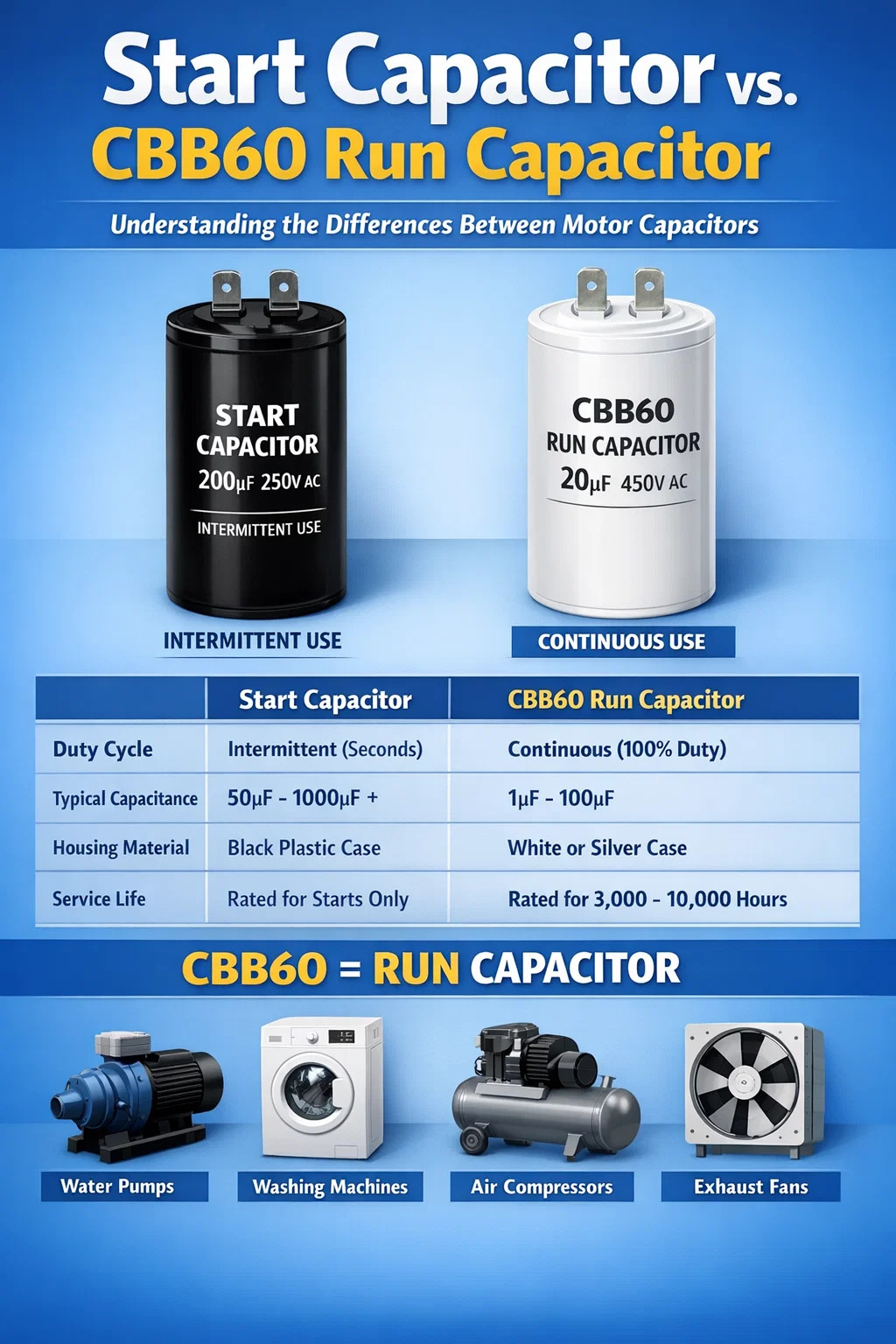 Diferencias funcionales: condensador de arranque frente a condensador de funcionamiento CBB60