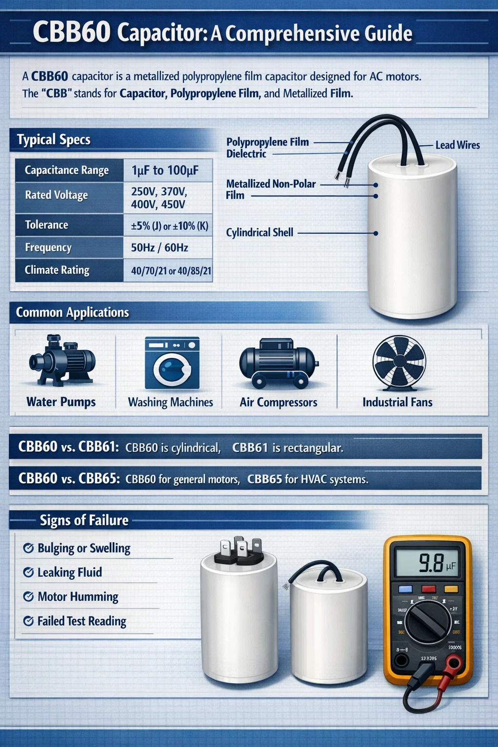 Construido dentro de una carcasa cilíndrica de plástico o aluminio, el CBB60 se caracteriza por sus propiedades de autorreparación y su alta resistencia de aislamiento. Se encuentra más comúnmente en electrodomésticos como lavadoras, bombas de agua y compresores de aire, y generalmente manejan voltajes entre 250 VCA y 450 VCA.