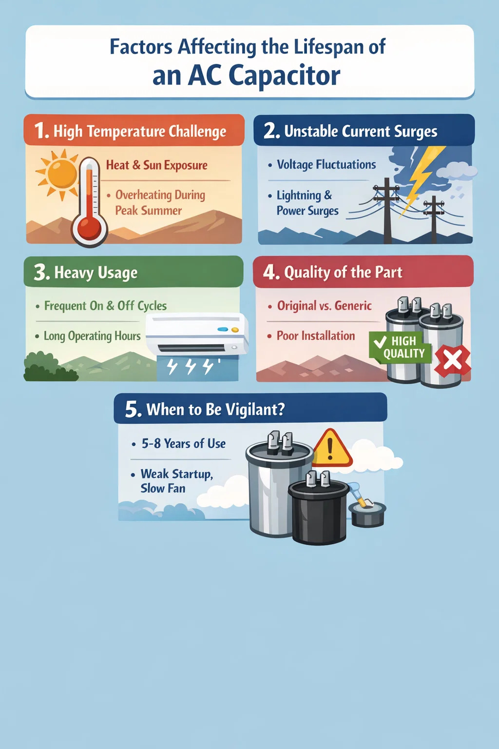 Fluctuaciones de voltaje: si el voltaje alrededor de su casa es inestable y fluctúa con frecuencia, el capacitor de CA debe cargarse y descargarse repetidamente para equilibrar la corriente. Este frecuente "trabajo estresante" acelera el envejecimiento de sus materiales internos.